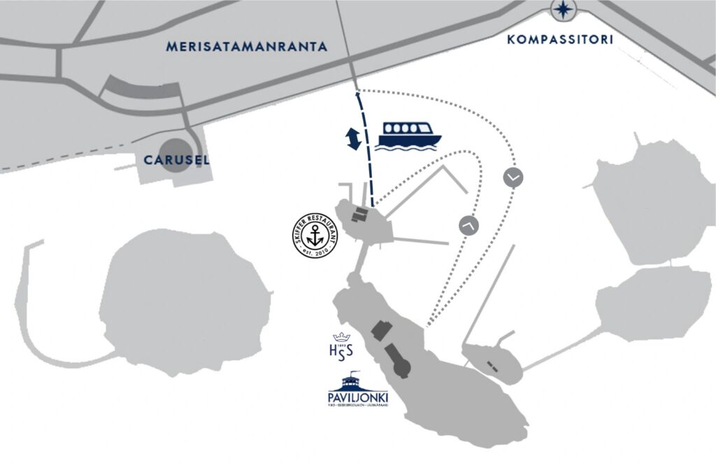 To get to HSS and Liuskasaari, you take a crossing boat, which departs from HSS’s own connecting ferry dock (Meristamanranta 6) halfway between Cafe Carusell and Kompassitori, by the ice cream kiosk.