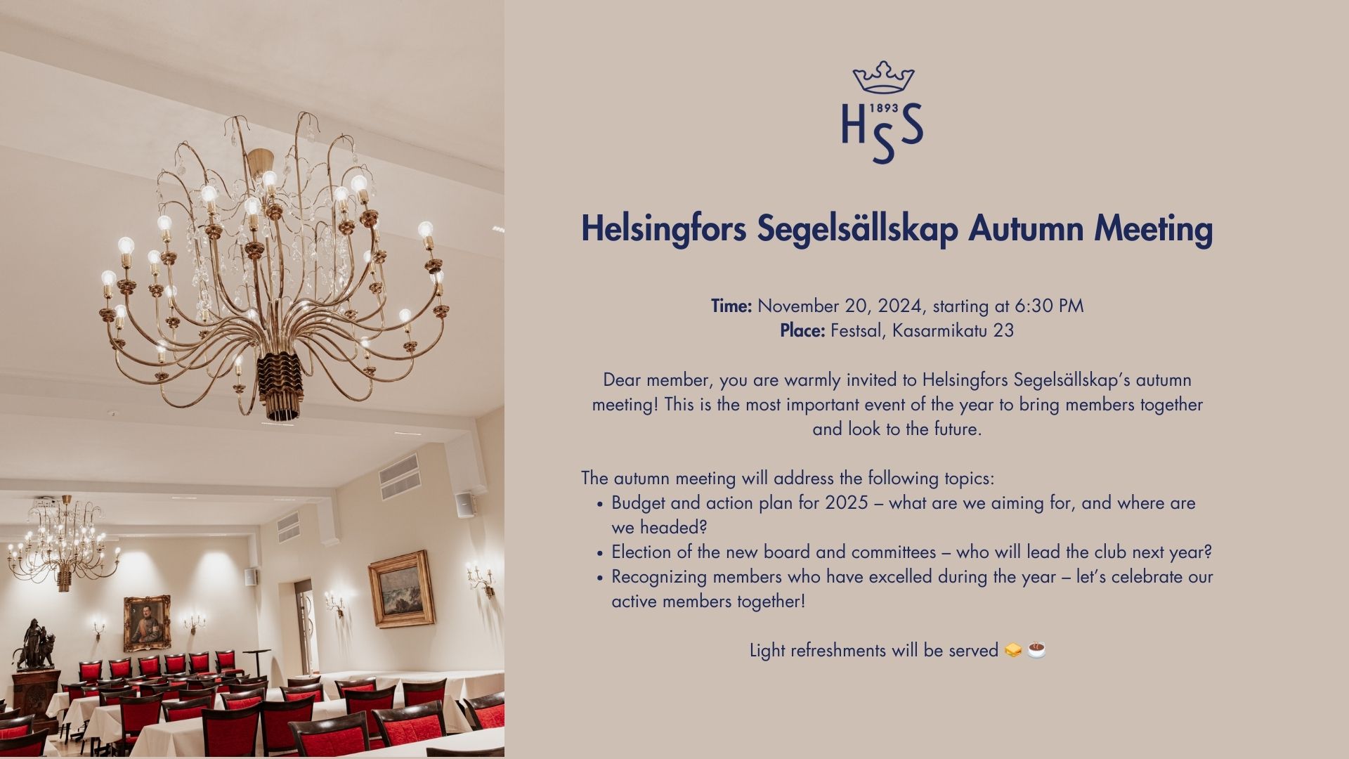 Dear member, you are warmly invited to Helsingfors Segelsällskap’s autumn meeting! This is the most important event of the year to bring members together and look to the future.