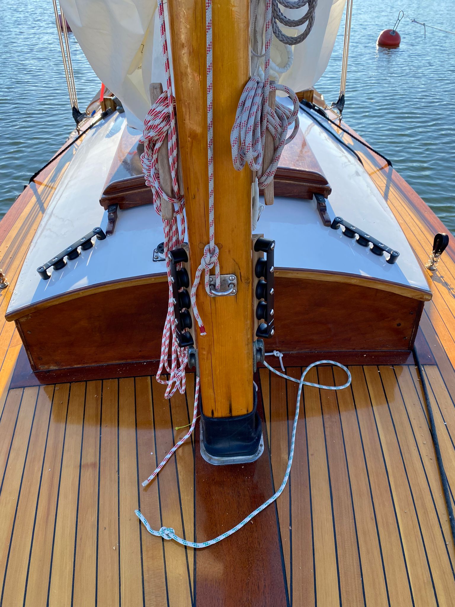 Kauden alussa kaikki Zoén fallit ja niiden lukot olivat mastolla. Ensimmäisestä purjehduksesta lähtien oli selvää, että niiden sijoittaminen ruffin kanteen sujuvoittaisi purjeiden nostoa ja laskua. Lisäksi se, että niitä pystyy operoimaan sitloodasta käsin eikä kovemmalla kelillä tarvitse mennä kannelle, oli turvallisuustekijä. Kyselimme naapuri Hai-veneiden kokemuksia ja kävimme kuvaamassa heidän ratkaisujaan. Mastolle asennettiin lopulta köysiohjaimet puupalkin kanssa, jotta ohjaimet saatiin sopivaan kulmaan. Ruffin kanteen tuli toiset köysiohjaimet ja ruffin takaosaan rivi rapulukkoja. Samalla aiemmin kannessa ollut vinssi sai lähteä, sillä tiedustelujemme mukaan se ei sopinut Haiden tyyliin. Rapulukkojen avulla saimme myös paikat ylä- ja alagaialle.