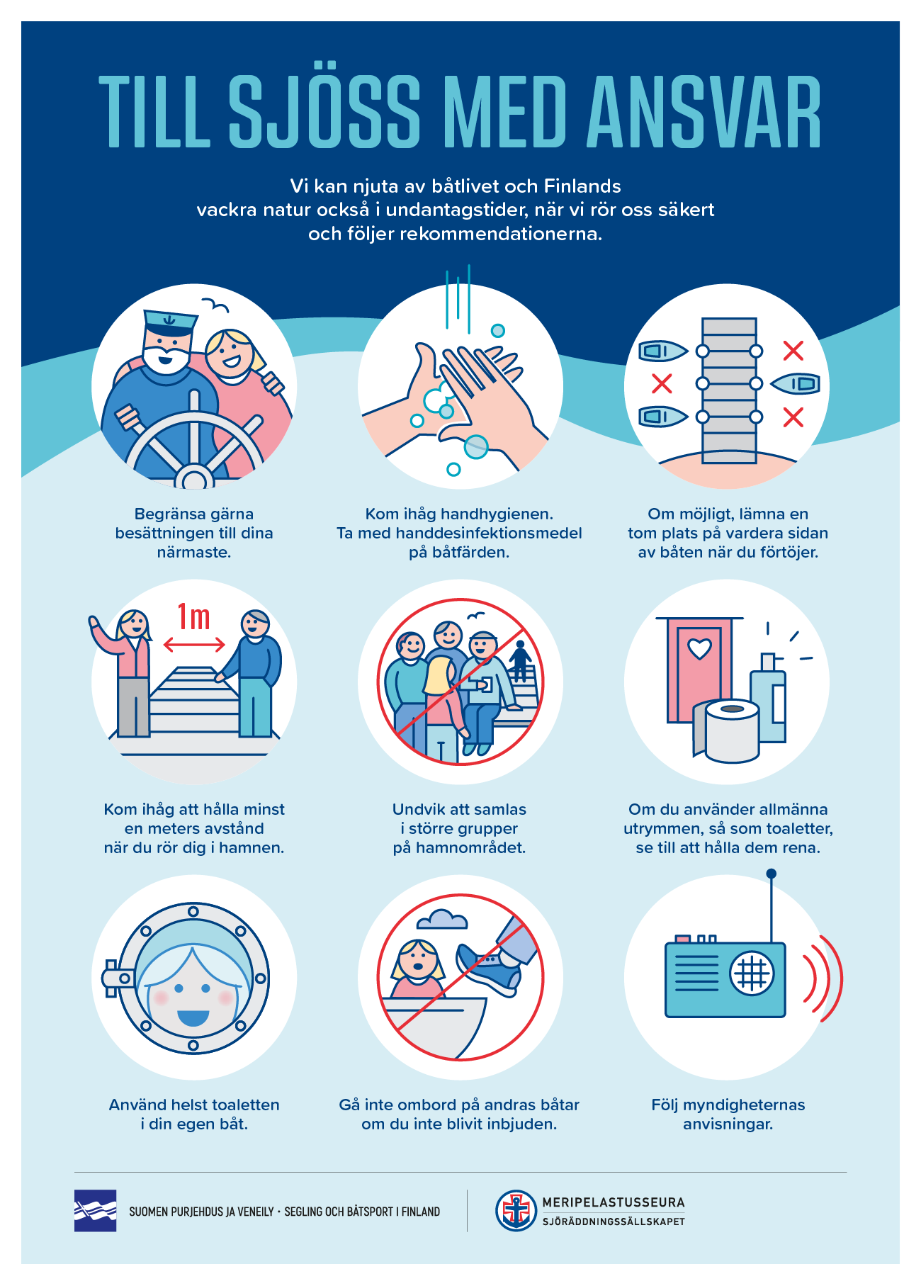 Coronaviruset har förändrat världen och därmed påverkat även seglandet samt motorbåts åkandet. Vi kan dock njuta att vara på vattnet och njuta av Finlands vackra natur då vi gör det ansvarsfullt och med åtanke. Segling och båtsport i Finland (SPV) och Finlands sjöräddningssällskap (SMPS – Suomen meripelastusseura) har tillsammans sammanfattat instruktioner till tiden med corona epidemin för båtförare. Instruktionerna ger råd över hur man ansvarsfullt kan gå till sjöss och hur man skall gå till väga vid en eventuell räddningssituationer under undantagstillståndet.
